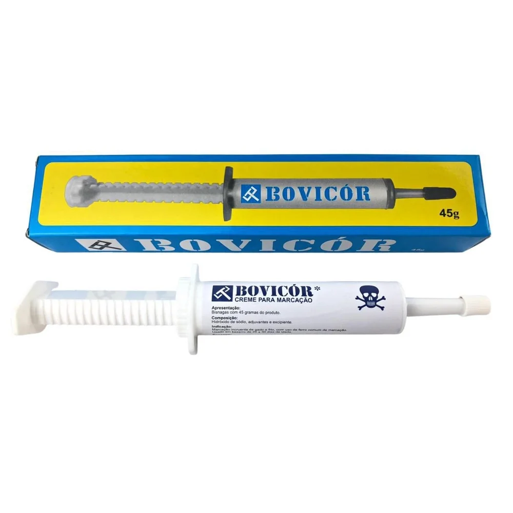O Bovicor é um creme específico para a marcação incruenta de bezerros, utilizando ferros comuns de marcar. Sua fórmula especial garante uma marcação nítida e permanente, facilitando a identificação individual dos animais ao longo de toda a sua vida.